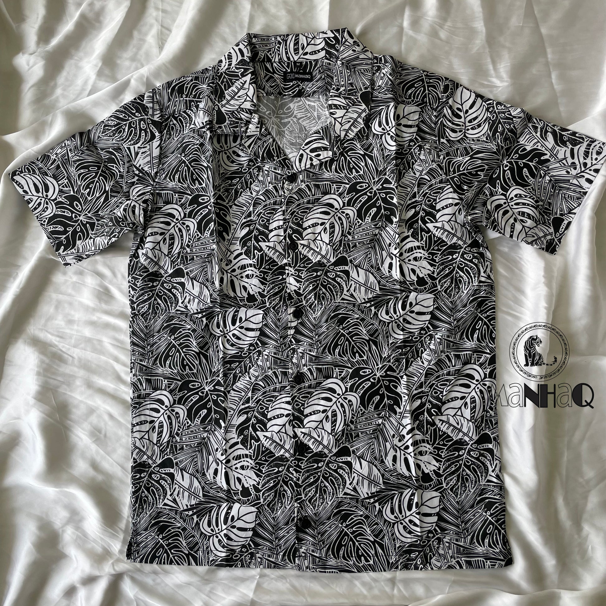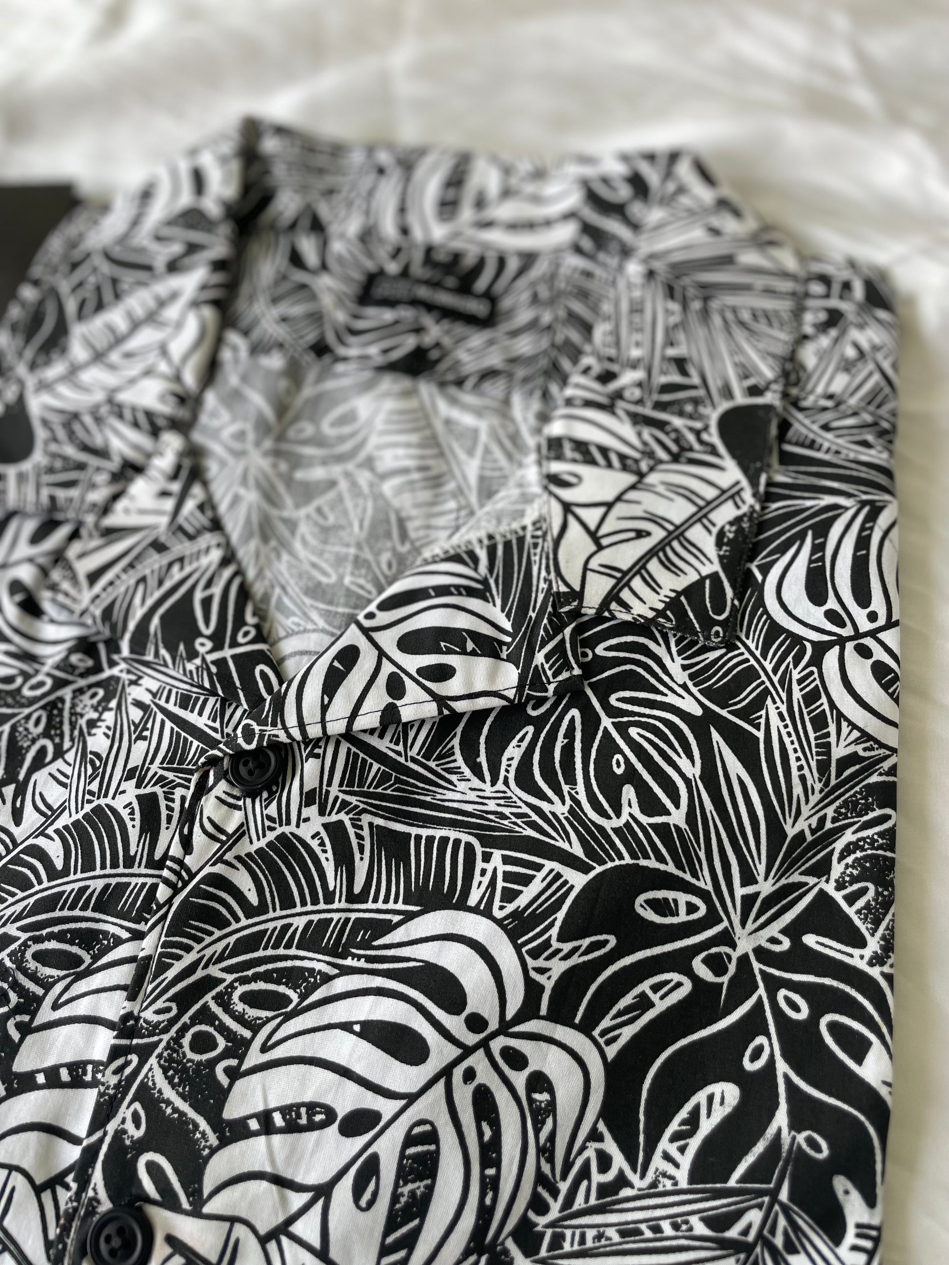 Leaf Print b&w Cuban Collar Shirt
