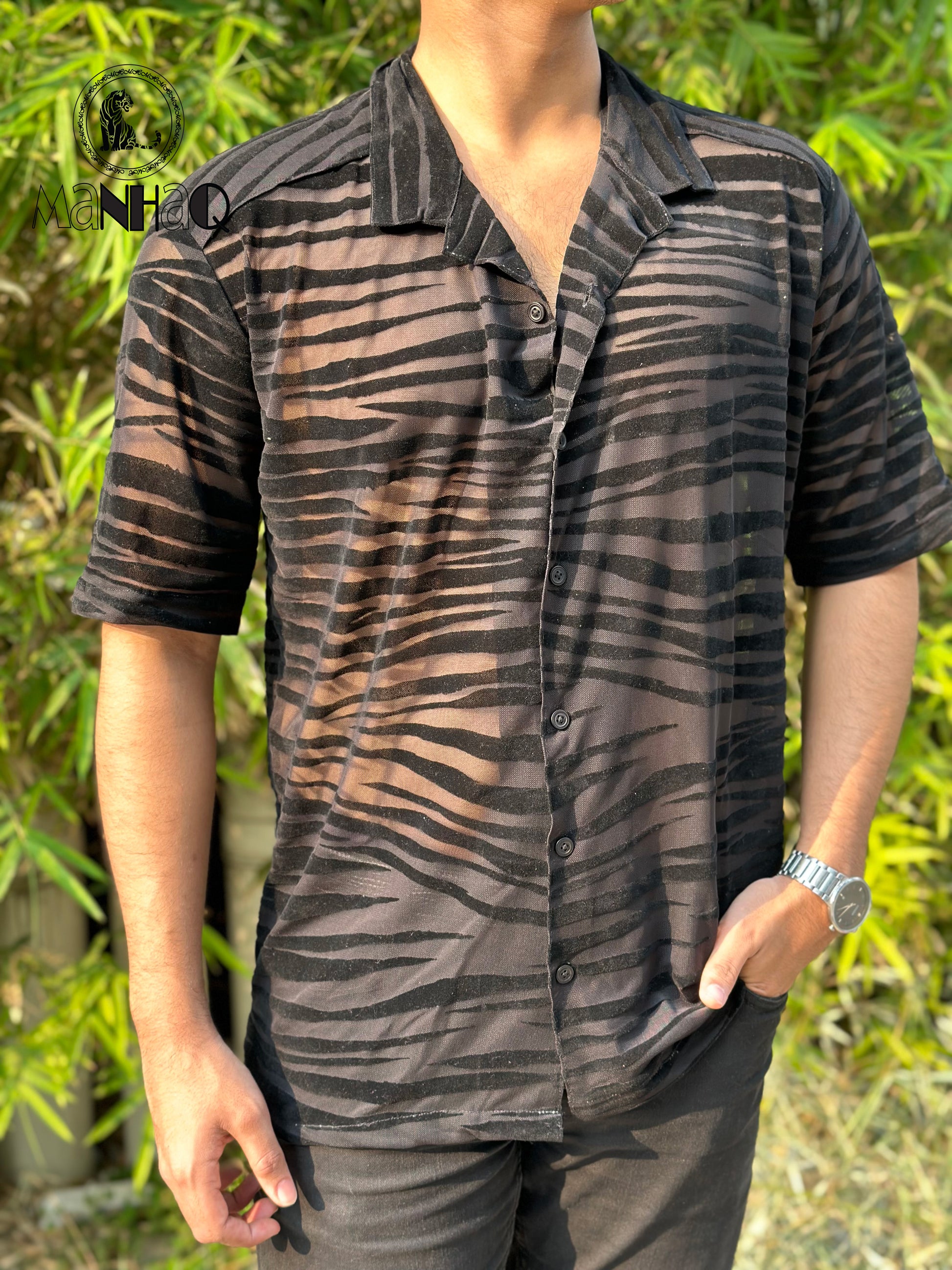 Get ready to turn heads with this transparent black shirt. Featuring a unique cuban collar, this top is perfect for making a statement while still staying cool and comfortable. The transparent fabric adds a touch of edginess to any outfit. Don't just blend in, stand out!